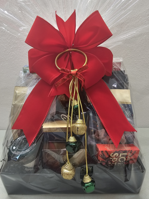 The A Joyous Season basket includes Chocolate Pralines, 3 Assorted Cookies, Breadsticks, Holiday Cake, Pretzels, Elki crackers, 2 cheese spreads, Olives, Bruschetta, Olive Spread, Pferfenusse Ginger Cookies, lobster or salmon spread.