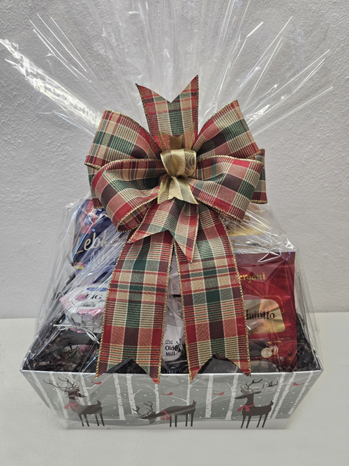 A sweet sweet combination that includes a Seasonal Cake, Italian Pastries, Allerlei Cookies, Amaretto Cookies, Preserve, Vergani Chocolates and Crackers. Notice: This year we will not be designing with wicker baskets. We will be designing in rigid boxes. Click the picture to view a "sample" decoration.