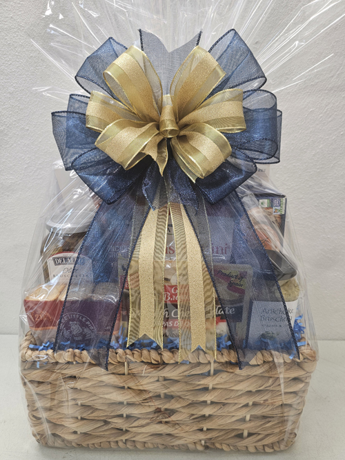 A tasty Gourmet basket with Rosemary cracker crisps, Sea Salt cracker crisps, Italian Salami, Fermin Chorizo, Fermin Serrano, Fermin Peppered Salami meat cuts, Olive Bruschetta spread, Red Pepper Bruschetta spread, Bruschettini mini toasts, Water Crackers, Manchego cheese tray and an Artichoke pesto spread.